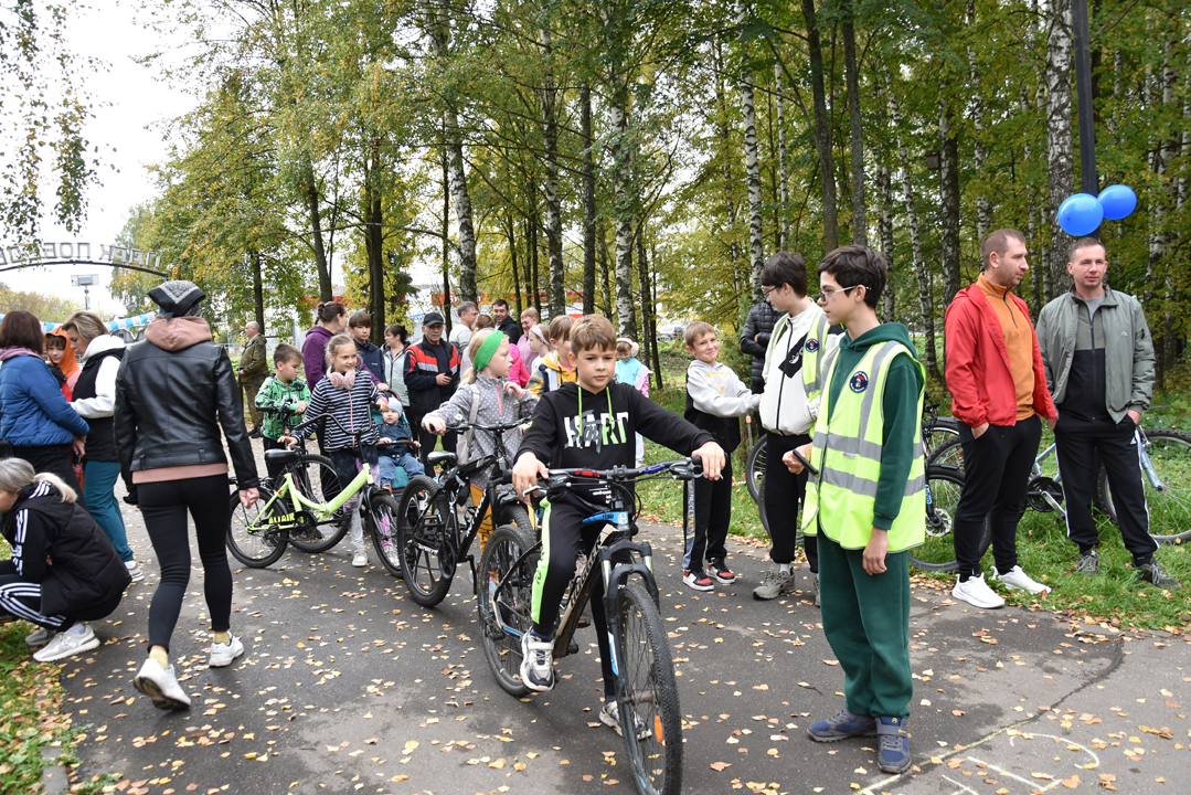 В воскресенье в парке Победы было много велосипедистов. Перед началом соревнований у каждого участника была возможность покататься на велосипеде или самокате по дорожкам парка, подготовиться к испытаниям, а главное понаблюдать за красивым осенним листопадом и сделать фотографии на его фоне.